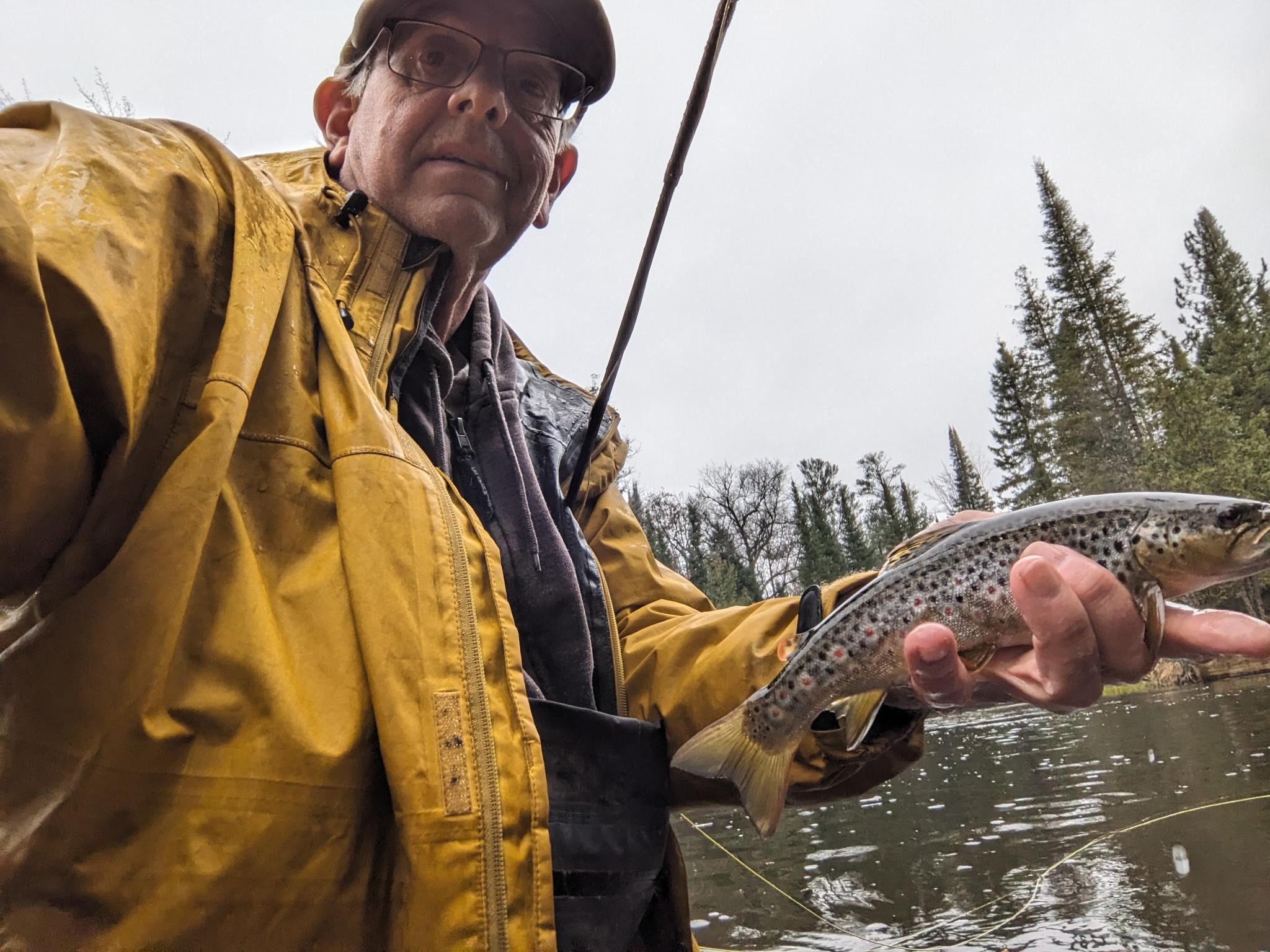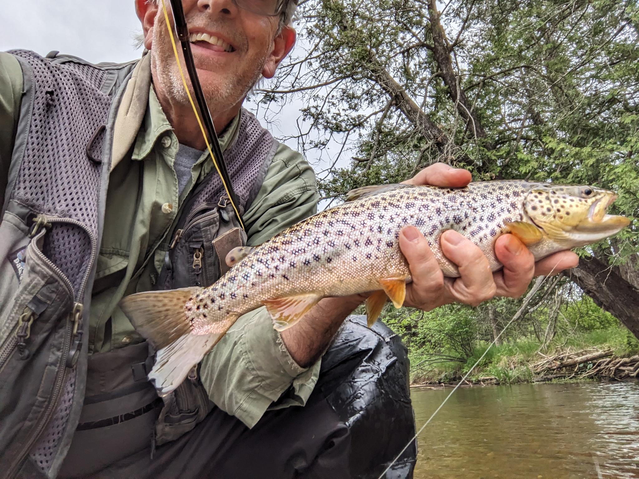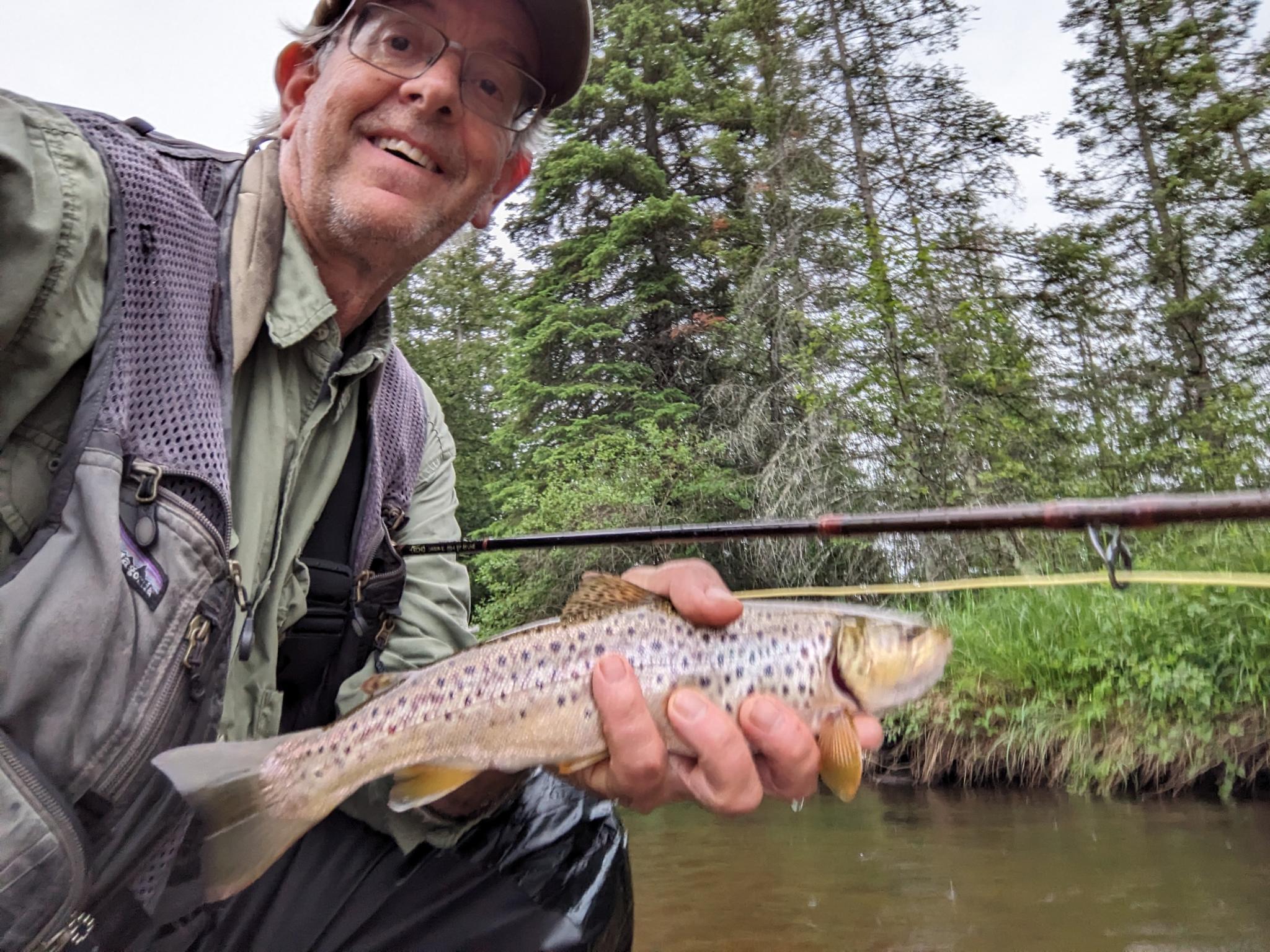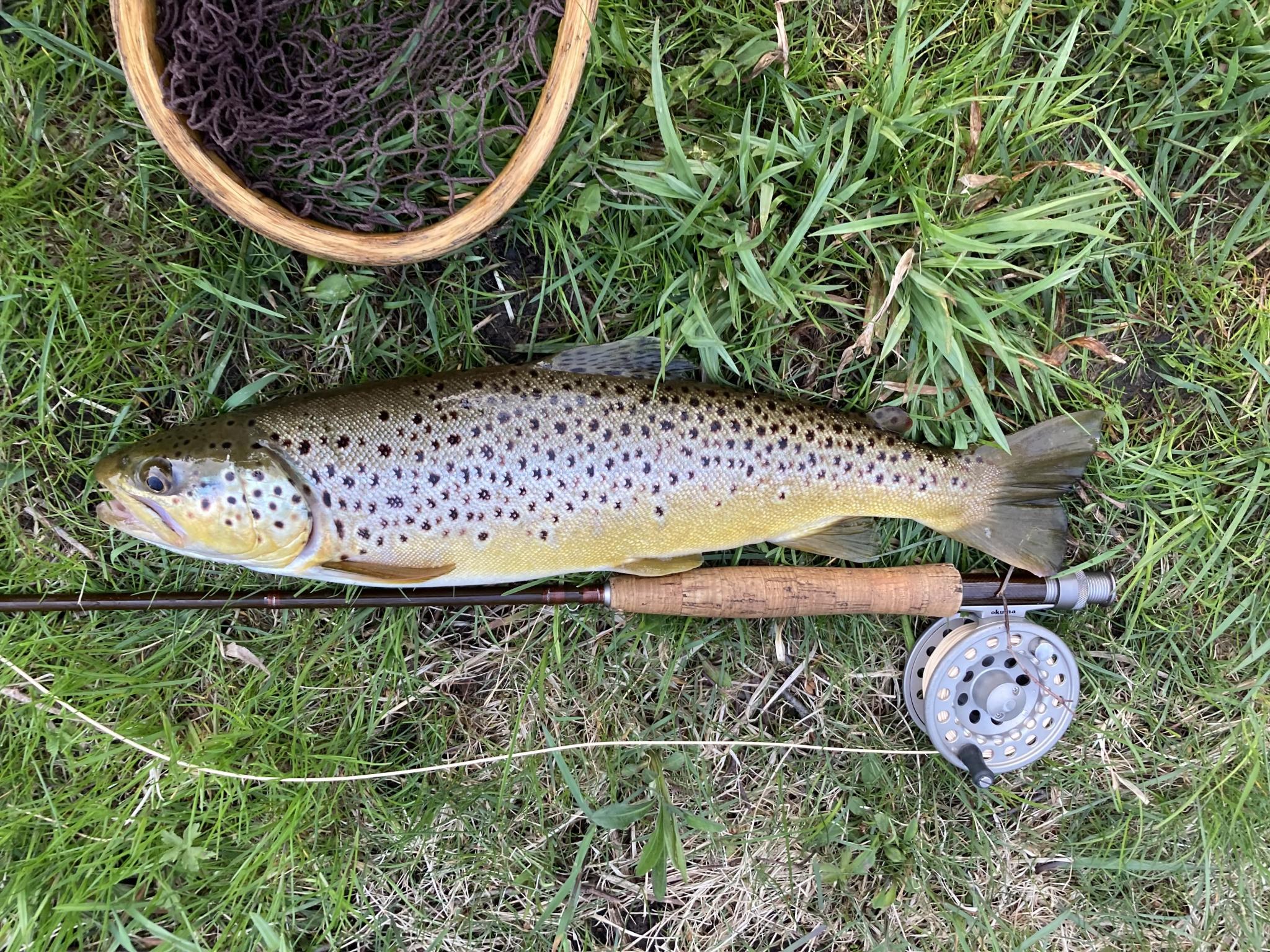 big brown bent my umpqua #14 hook in the riffle above bend out from the birch clump trees.