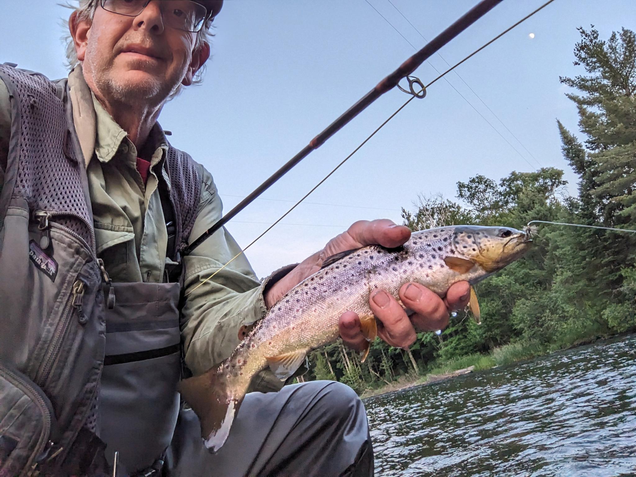 hendrickson spinners have finished. just a few spinners tonight and a few single rises. last night was a fast and furious feed on spinners that I wasn't ready for (messing with a caddis fly). I finally hooked a big brown on a spinner at the mio bend (there were three or four feeding) and lost it after awhile. I thought I was using a #12 tiemco hook but later discovered that I had hastily tied on the dreaded #14 umpqua hook in my panicky state. That makes 4 big browns lost on the #14 and one landed.
