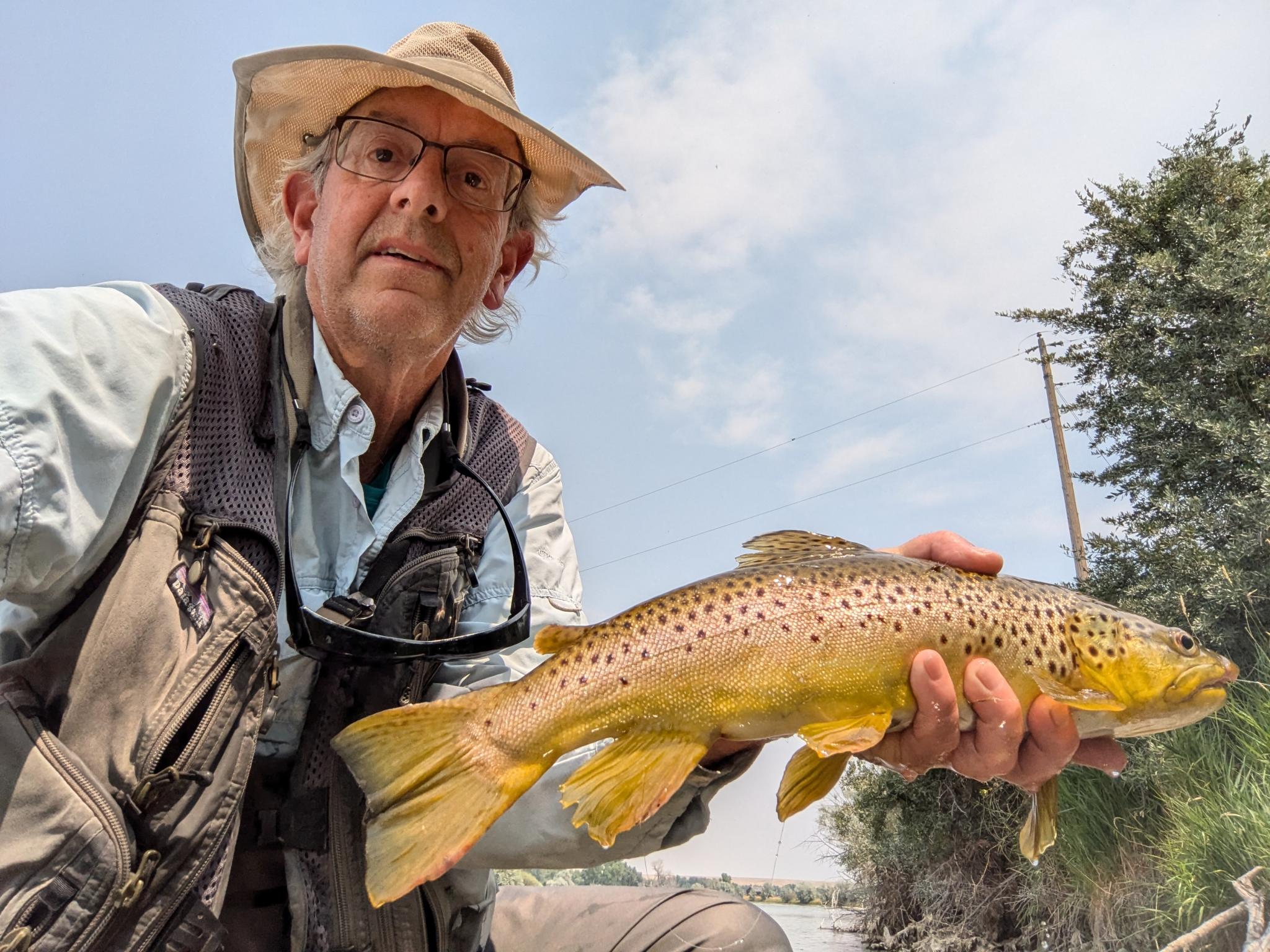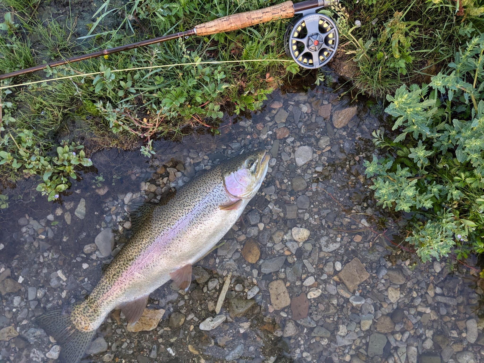 big brown bent my umpqua #14 hook in the riffle above bend out from the birch clump trees.
